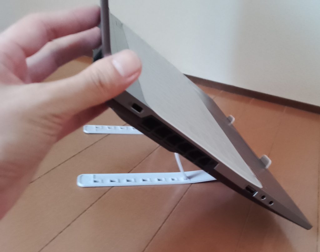 Aliexpressで格安で購入したPCスタンドは、今回試した軽量の12インチ1㎏未満のノートPCでは支障なく使用できるが、15インチの2㎏オーバーのPCではその材質からPCを安定して載せることができなかった。