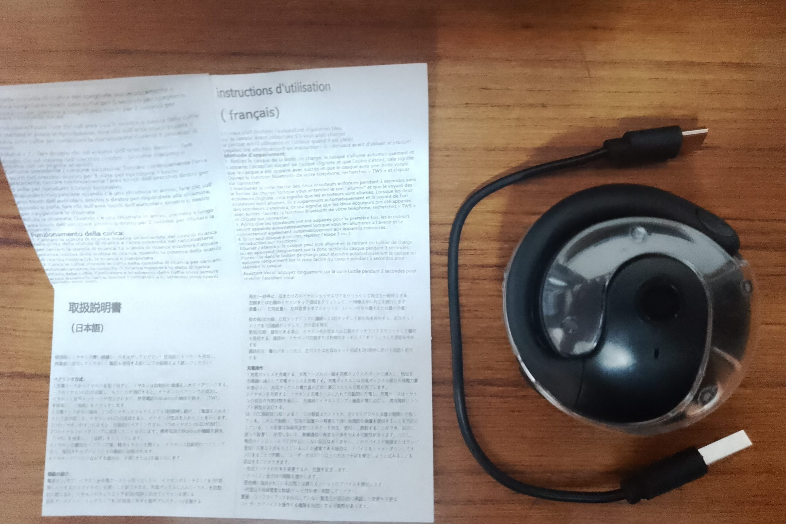 アプリでの注文から8日後に包みが届いた。説明書とイヤフォン1セットと充電アダプター、タイプcUSBケーブルが入っていた。